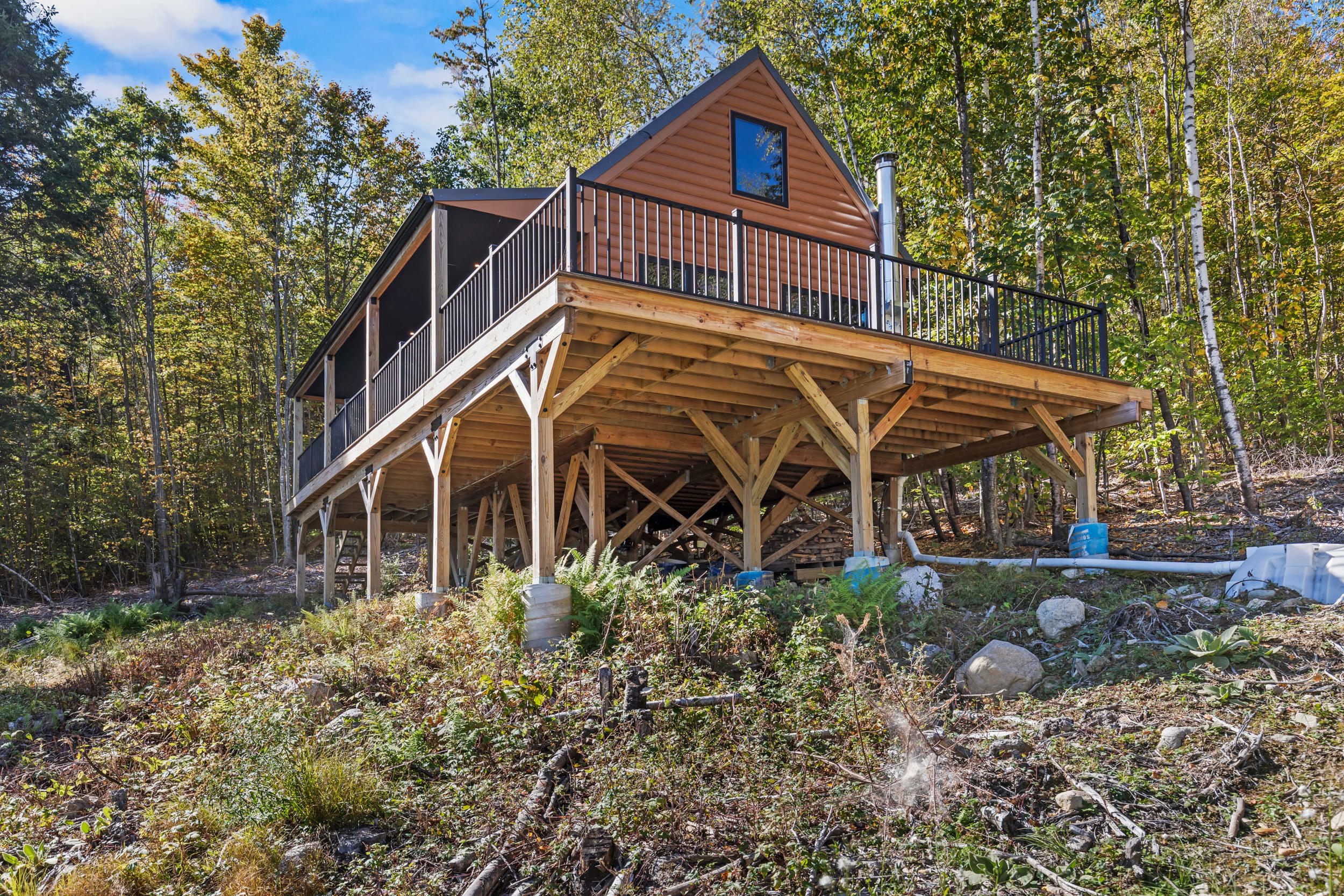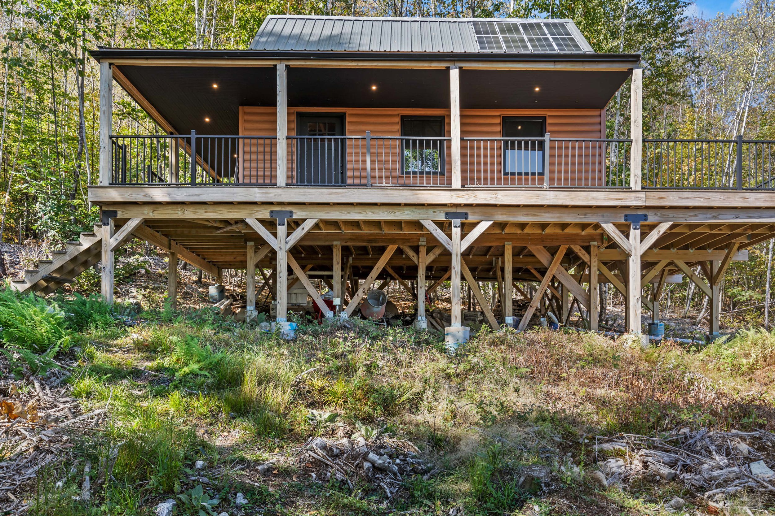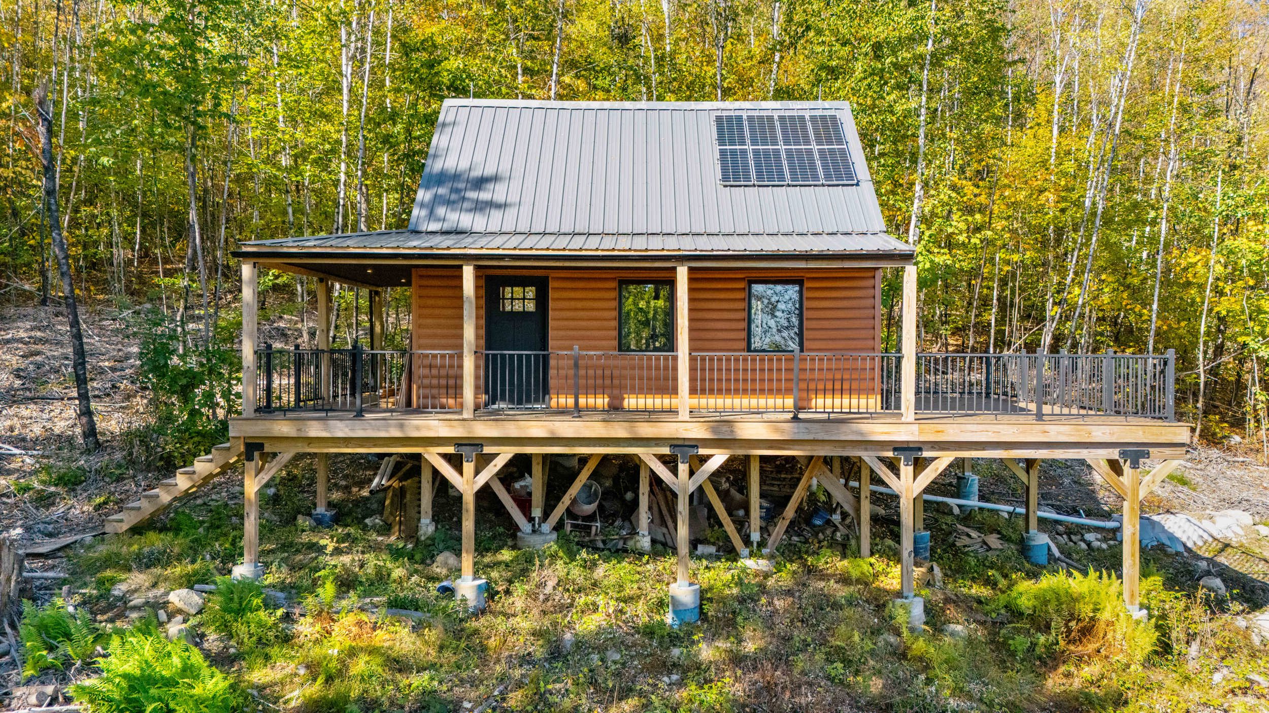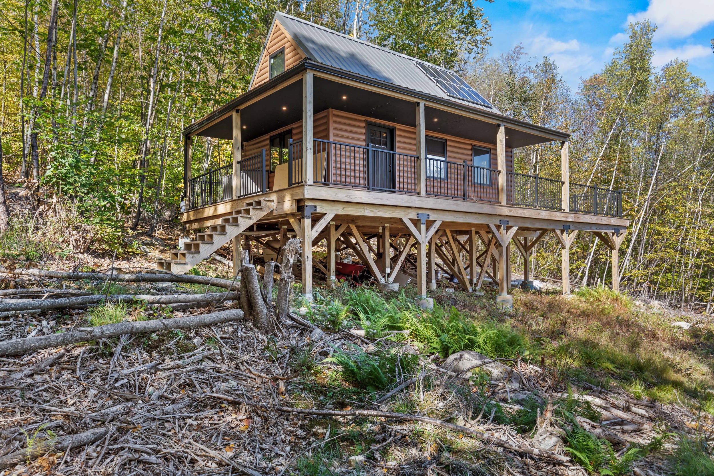 Welcome to your private Maine retreat in Brownfield! Set on 14 acres of untouched land, this off-grid cabin offers the peace and seclusion of the Maine woods with breathtaking views of both the Maine and New Hampshire mountains. Built in 2021, it captures the rustic charm of a classic Maine ''camp'' while offering modern upgrades rarely found in off-grid living. Step inside and you'll be greeted by warm wood interiors, vaulted ceilings, and picture windows that frame the surrounding forest and mountains. The open-concept layout includes a beautifully upgraded kitchen with stainless steel appliances, a gas stove, and a refrigerator. The spacious living area centers around a striking Jøtul fireplace, creating a cozy year-round retreat. The full bathroom blends rustic charm with practical amenities, featuring a shower and composting toilet. A handcrafted spiral staircase leads to two cozy lofts, offering inviting spaces to rest after a day in the woods or mountains. Outside, a large wraparound deck provides the perfect spot to sip your morning coffee, stargaze at night, or simply take in the sweeping mountain views. Sustainable features include solar panels, insulated walls, a water cistern system, composting septic, and a generator hookup, ensuring comfort and peace of mind while enjoying life off the grid. Wildlife sightings are frequent, with deer, moose, and more often passing through the property. Despite its private setting, the cabin is conveniently located just 15 minutes from downtown North Conway and Fryeburg, one hour from Portland, and 2.5 hours from Boston. Escape to 470 Center Conway Road and discover the perfect blend of rustic charm, practical living, and Maine wilderness.