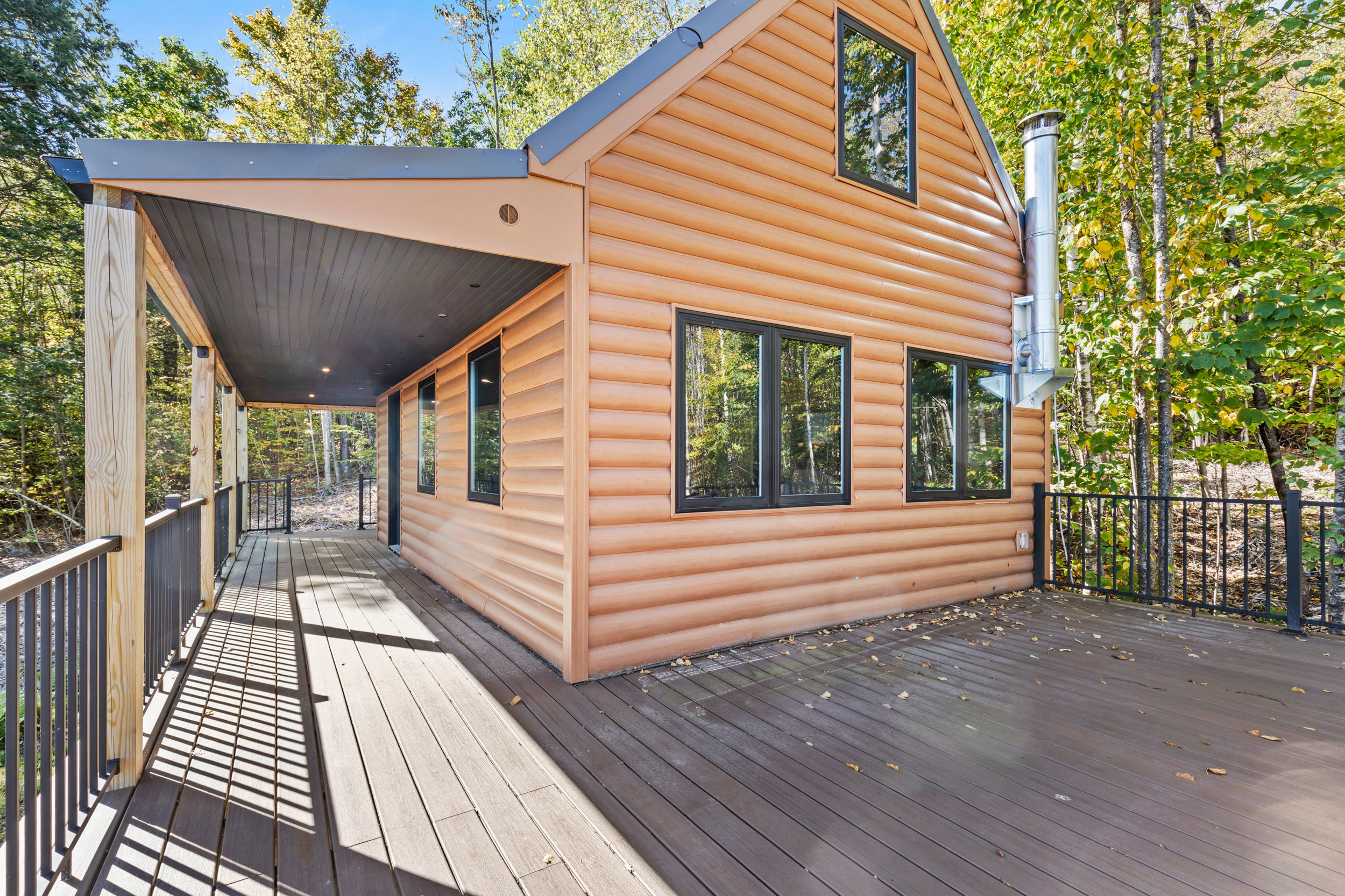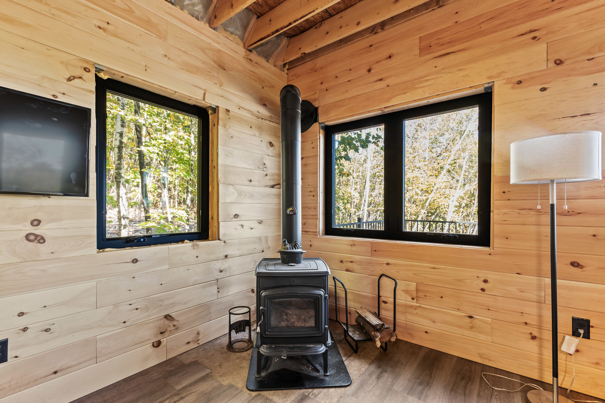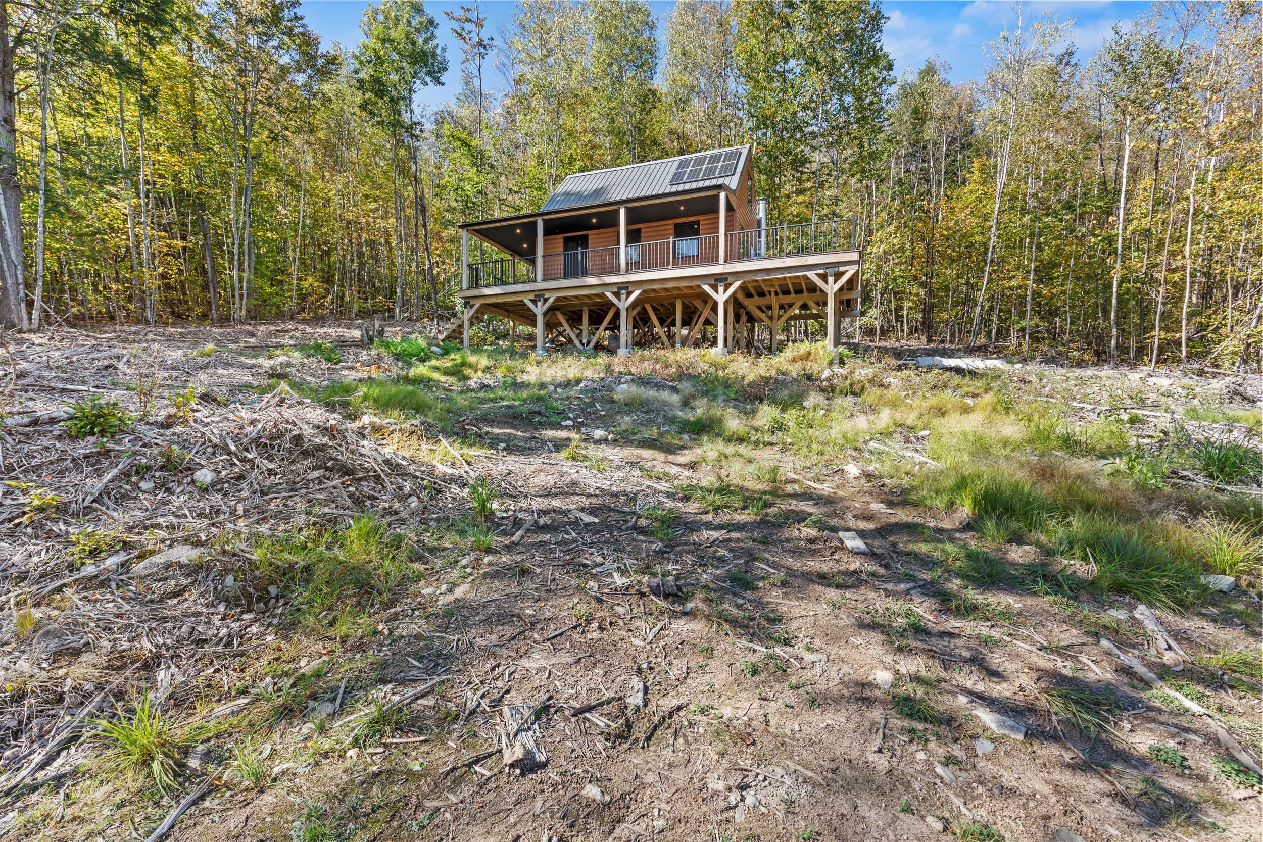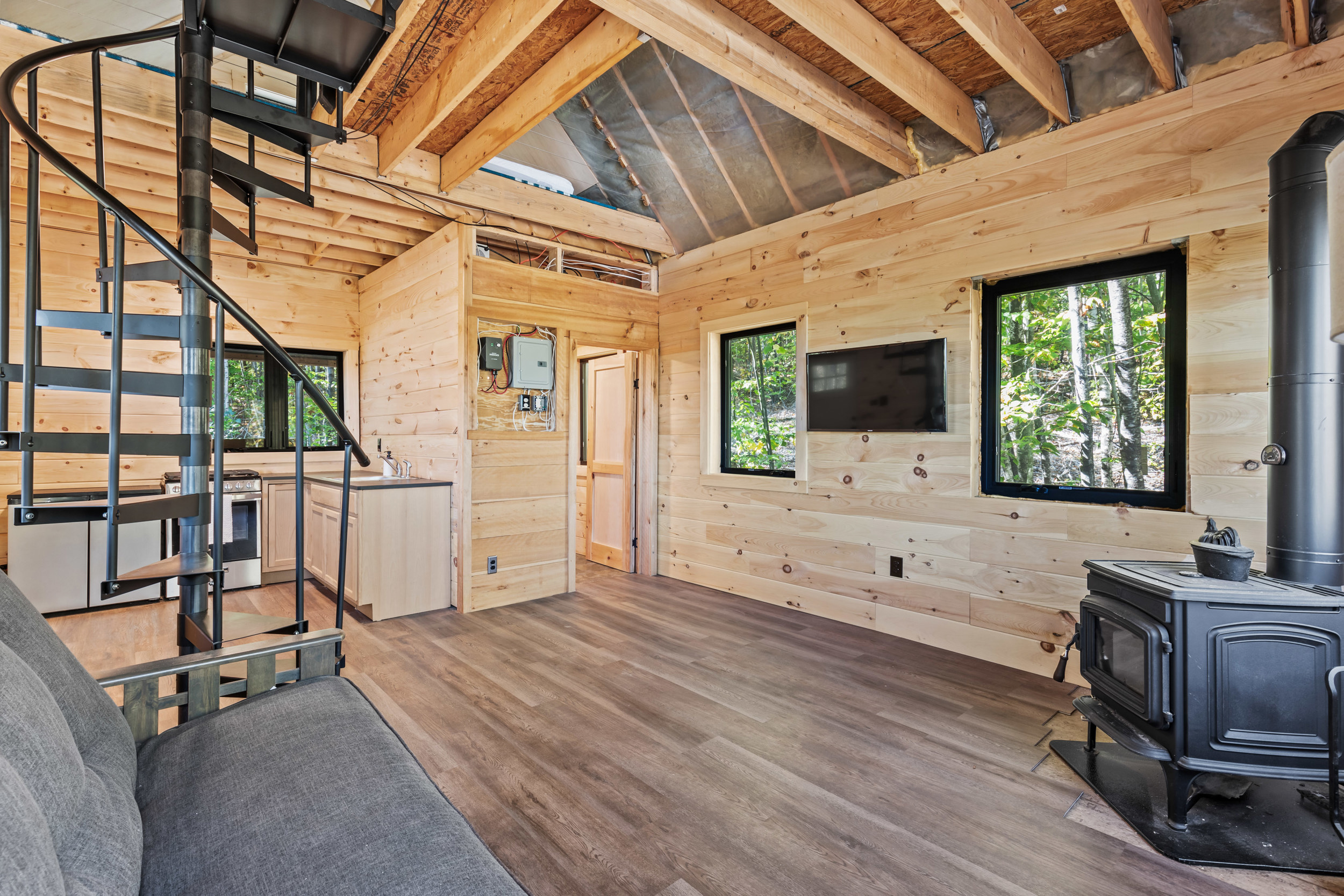Welcome to your private Maine retreat in Brownfield! Set on 14 acres of untouched land, this off-grid cabin offers the peace and seclusion of the Maine woods with breathtaking views of both the Maine and New Hampshire mountains. Built in 2021, it captures the rustic charm of a classic Maine ''camp'' while offering modern upgrades rarely found in off-grid living. Step inside and you'll be greeted by warm wood interiors, vaulted ceilings, and picture windows that frame the surrounding forest and mountains. The open-concept layout includes a beautifully upgraded kitchen with stainless steel appliances, a gas stove, and a refrigerator. The spacious living area centers around a striking Jøtul fireplace, creating a cozy year-round retreat. The full bathroom blends rustic charm with practical amenities, featuring a shower and composting toilet. A handcrafted spiral staircase leads to two cozy lofts, offering inviting spaces to rest after a day in the woods or mountains. Outside, a large wraparound deck provides the perfect spot to sip your morning coffee, stargaze at night, or simply take in the sweeping mountain views. Sustainable features include solar panels, insulated walls, a water cistern system, composting septic, and a generator hookup, ensuring comfort and peace of mind while enjoying life off the grid. Wildlife sightings are frequent, with deer, moose, and more often passing through the property. Despite its private setting, the cabin is conveniently located just 15 minutes from downtown North Conway and Fryeburg, one hour from Portland, and 2.5 hours from Boston. Escape to 470 Center Conway Road and discover the perfect blend of rustic charm, practical living, and Maine wilderness.