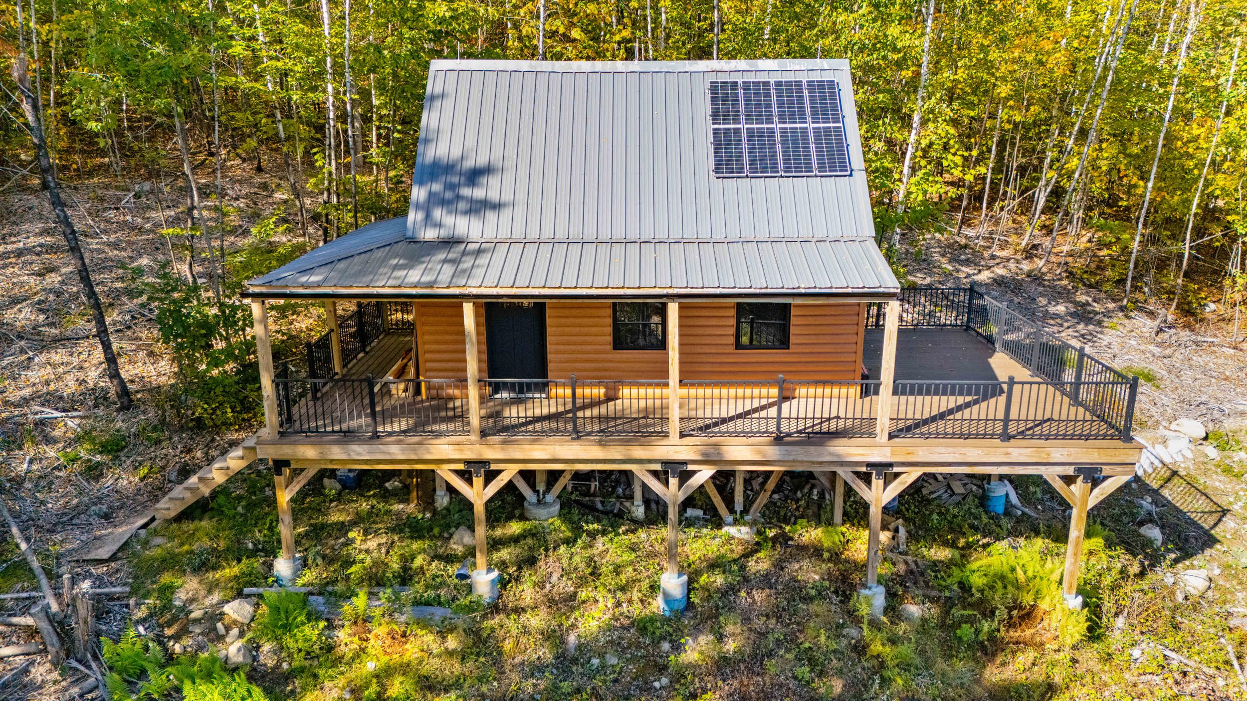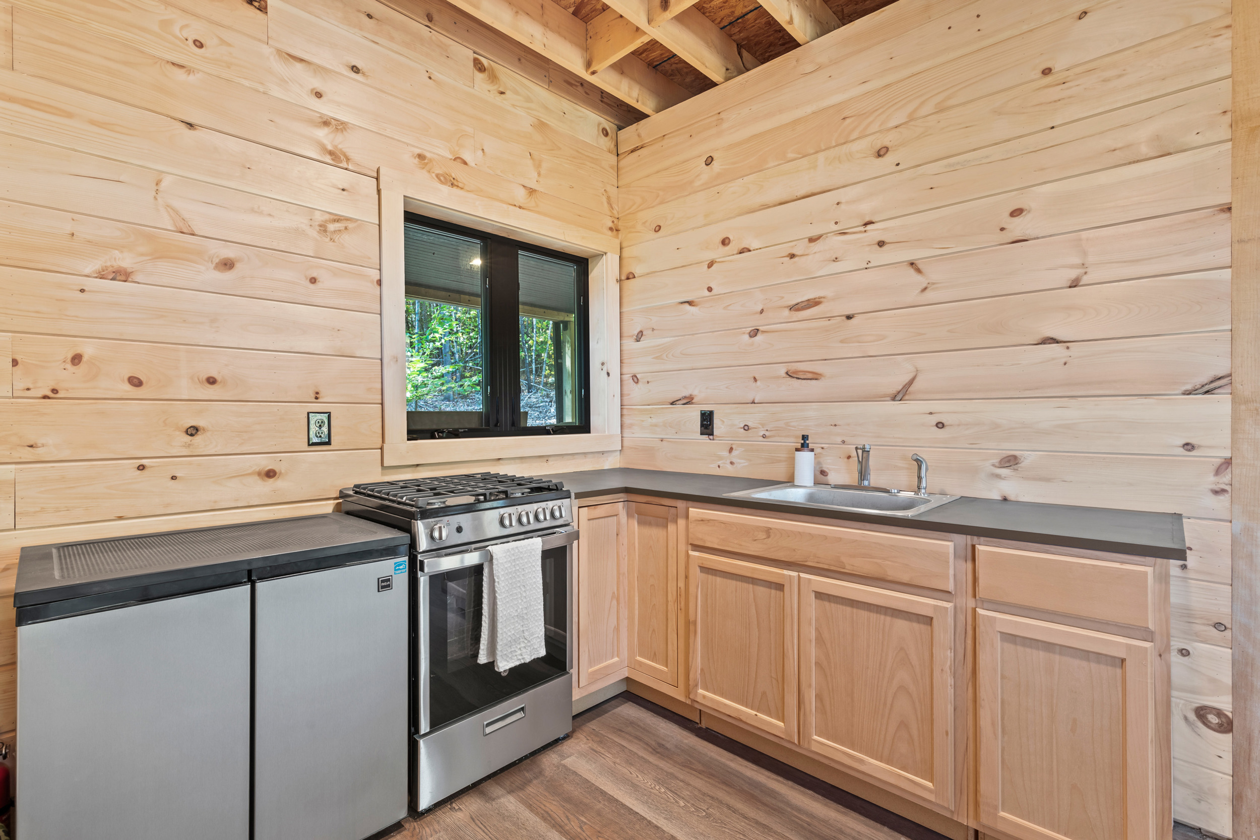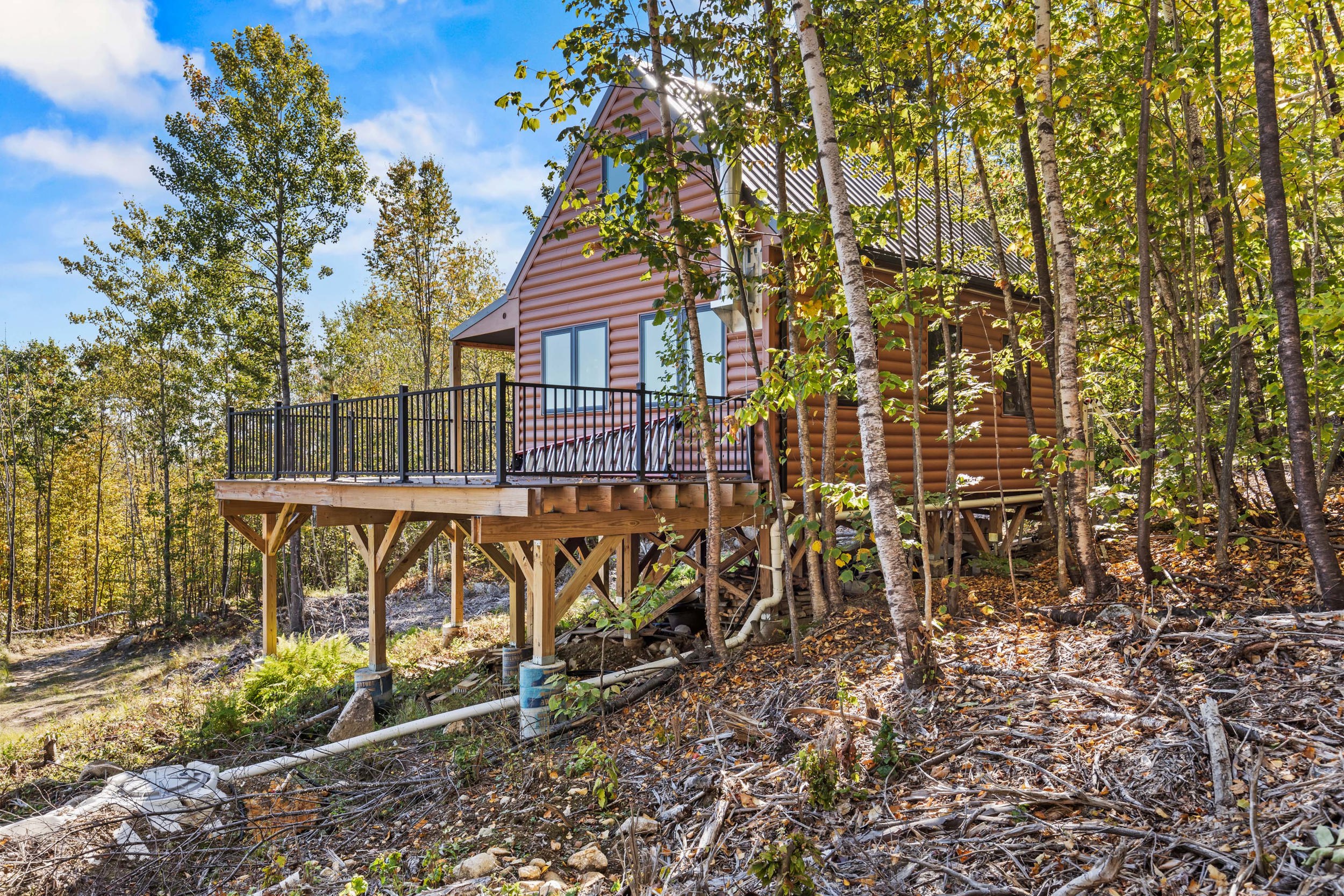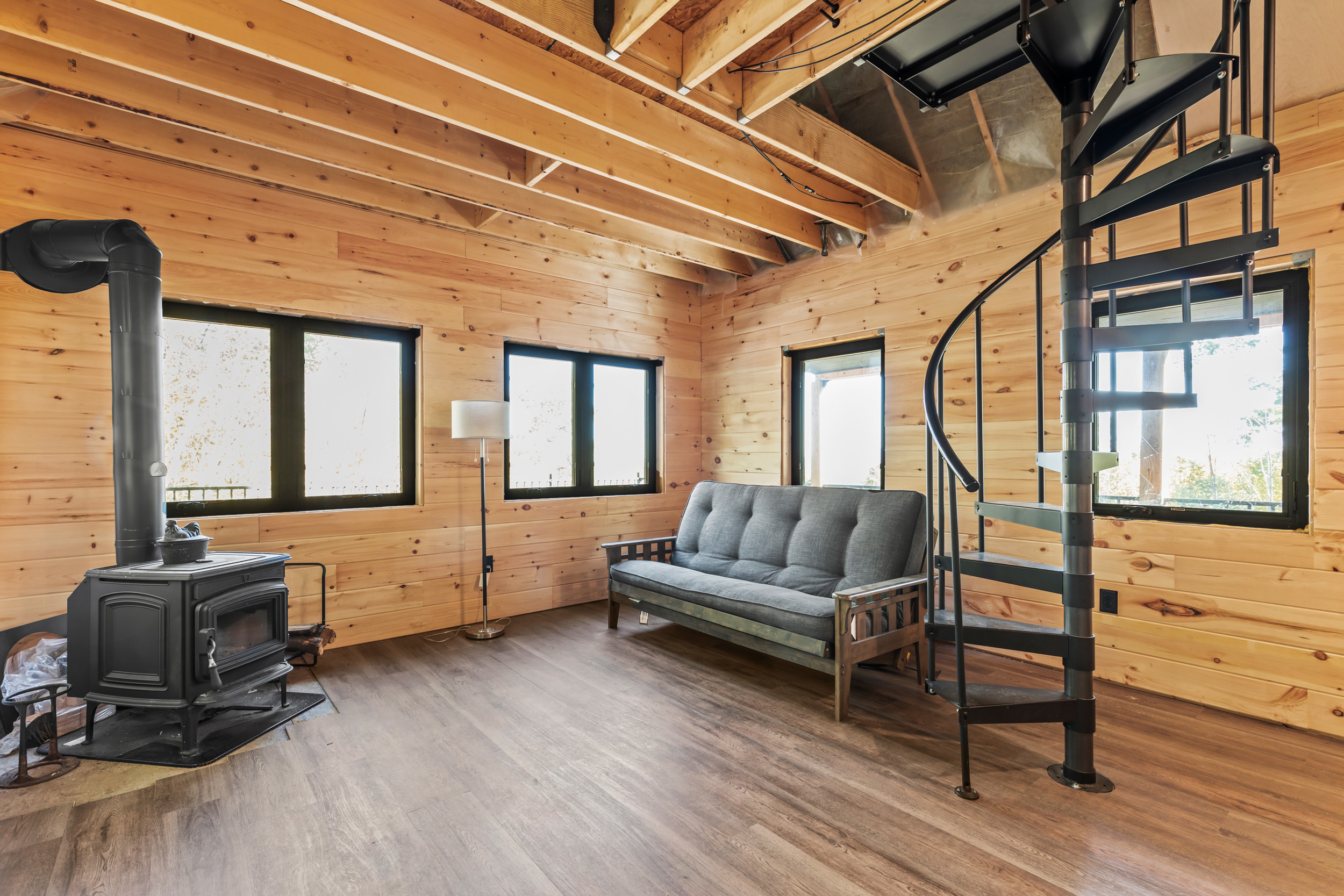 Welcome to your private Maine retreat in Brownfield! Set on 14 acres of untouched land, this off-grid cabin offers the peace and seclusion of the Maine woods with breathtaking views of both the Maine and New Hampshire mountains. Built in 2021, it captures the rustic charm of a classic Maine ''camp'' while offering modern upgrades rarely found in off-grid living. Step inside and you'll be greeted by warm wood interiors, vaulted ceilings, and picture windows that frame the surrounding forest and mountains. The open-concept layout includes a beautifully upgraded kitchen with stainless steel appliances, a gas stove, and a refrigerator. The spacious living area centers around a striking Jøtul fireplace, creating a cozy year-round retreat. The full bathroom blends rustic charm with practical amenities, featuring a shower and composting toilet. A handcrafted spiral staircase leads to two cozy lofts, offering inviting spaces to rest after a day in the woods or mountains. Outside, a large wraparound deck provides the perfect spot to sip your morning coffee, stargaze at night, or simply take in the sweeping mountain views. Sustainable features include solar panels, insulated walls, a water cistern system, composting septic, and a generator hookup, ensuring comfort and peace of mind while enjoying life off the grid. Wildlife sightings are frequent, with deer, moose, and more often passing through the property. Despite its private setting, the cabin is conveniently located just 15 minutes from downtown North Conway and Fryeburg, one hour from Portland, and 2.5 hours from Boston. Escape to 470 Center Conway Road and discover the perfect blend of rustic charm, practical living, and Maine wilderness.
